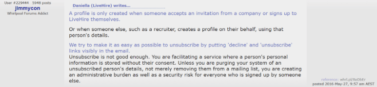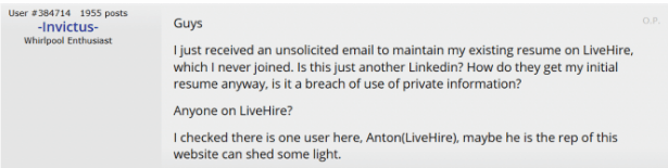 Now, the real question here is how Livehire built up its database of potential employees. Indeed, Whirlpool user “Invictus” asked that very question quite some time ago (in 2015).