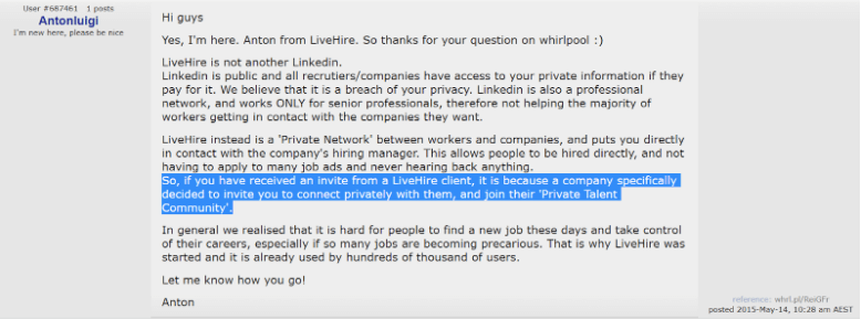 Perhaps the best answer came from whirlpool user “Antonluigi”, who claims to work for Livehire and happens to share a name with the founder and CEO.