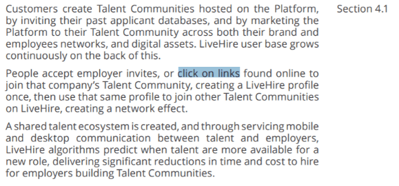 Now, we’re not sure about this, but it seems that once clients have accepted entry into one ‘talent community’, simply by clicking on a link, then their ‘profile’ becomes available for all Livehire’s customers to invite to their own talent community. Now, what sort of information might that profile contain? Let’s look, again, to the prospectus: