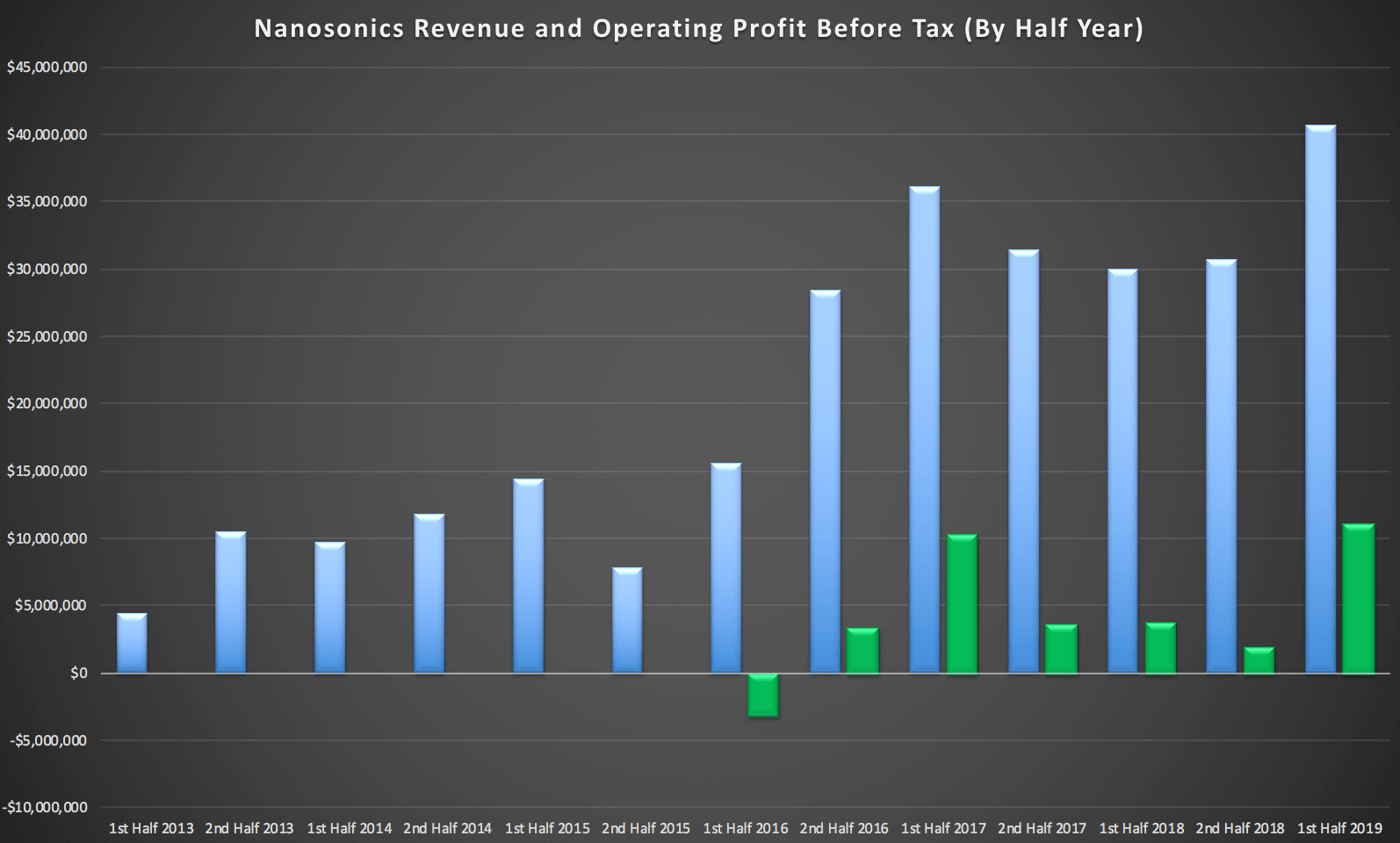 Disinfection specialist Nanosonics (ASX:NAN) has posted another record set of numbers for the first half of 2019, with revenue climbing 36% higher to $40.7m. Pre-tax profit was 195% higher at $11m. You can see in the chart below that the company has quite lumpy profits, but there’s no denying the revenue was good this half.