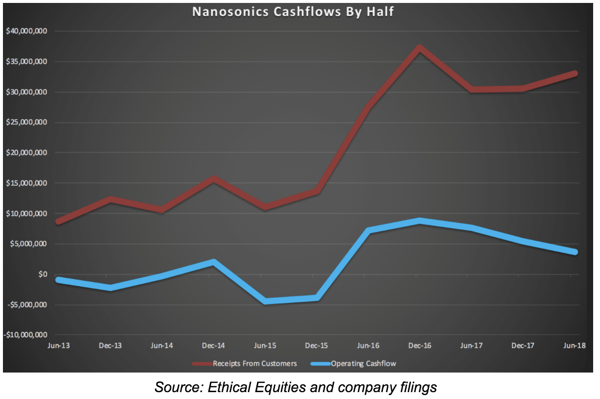 In the first half, Nanosonics sales were down 17%, a result that was attributed to a particularly strong prior period in which a major distributor undertook a large restocking. The previous corresponding half also benefited from a one-off tax benefit to the tune of $10m.
