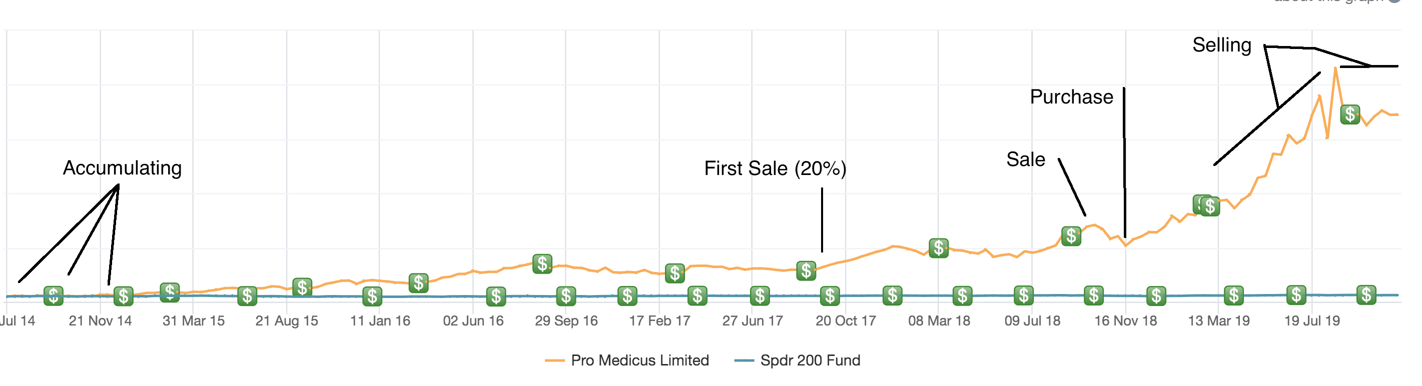 As the company continued to win contracts and grow revenue, the market begun pricing in further wins. Whereas in late 2013 the price arguably reflected announced wins, rather than future wins, by 2019 the price arguably reflects many future wins, including both Visage and the Vendor Neutral Archive product. In this way, the market has become more optimistic and is now willing to pay a higher multiple of (much increased) earnings. You can see in the chart how I've traded the stock over the years. I still hold despite seeing it as too richly valued -- see here for my lament on why.