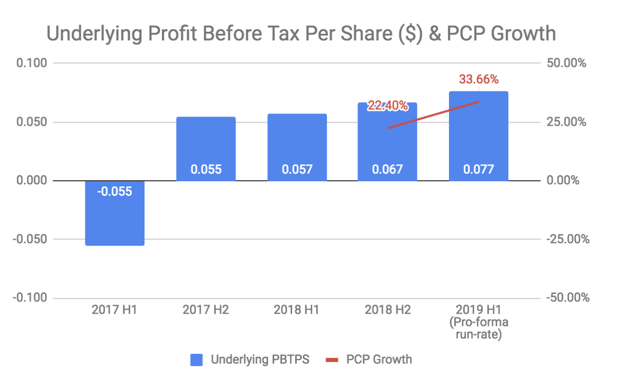 I did not adjust for tax because Zenitas’ tax rates have fluctuated from half to half. For example, it earned a tax credit in the second half of 2017 and incurred an 18.4% charge in the first half of 2018. I could have applied a 30% tax rate to all periods but since the non-controlling interests are stated after tax, this could also potentially distort the picture. Clearly, tax is a real cost that reduces shareholder profits and the following chart is intended to provide a sense of the underlying trend rather than absolute figures.