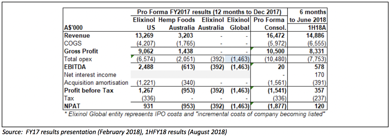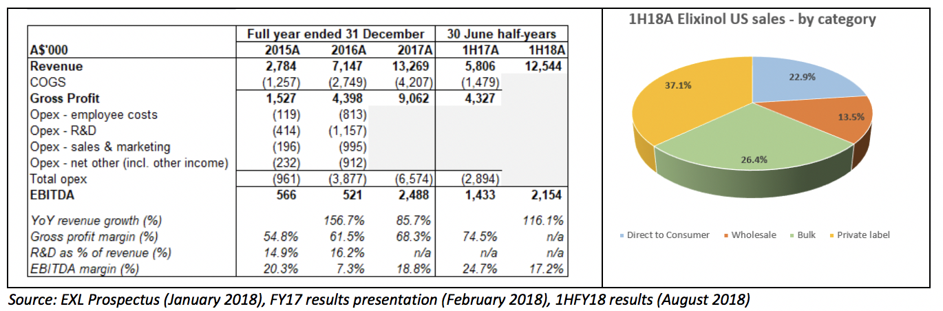 The US business is the largest contributor to group revenue and earnings and is likely to be for several years to come. Founded in 2014 after the US Farm Bill was passed, Elixinol US is a vertically integrated manufacturer and distributor of industrial hemp-based CBD nutraceutical and skincare products. Domestic volumes account for ~85% of sales, and exports to distributors in 40 other countries (predominantly Europe, Japan and South Africa) the remainder. The US product range comprises 30 SKUs including hemp oils, capsules and essences, topical CBD-based products such as lip balms and skin creams, and even CBD dog treats (aimed at treating pet anxiety). Elixinol US has grown quickly since inception and in the last financial year (to December 2017) nearly quintupled EBITDA on an 86% increase in revenue. For the half-year to 30 June 2018, Elixinol US more than doubled revenue, though EBITDA margins declined slightly – probably due to further investment in the business for growth (most likely sales & marketing ahead of the expected passing of the 2018 Farm Bill, key management hires, and also upgrades to back office systems to prepare the business for growth). Management have not provided formal full year FY18 guidance, though we note that 1H18 sales were already 95% of total full-year FY17 sales.