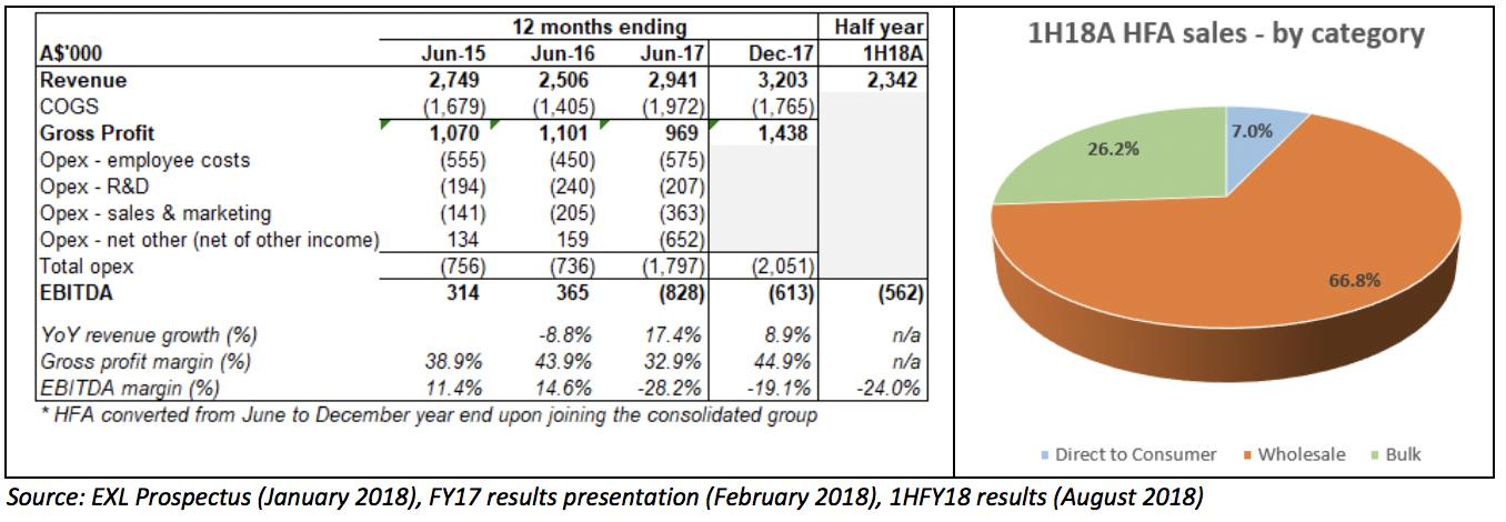 The latest financials for HFA (half year to June 2018) suggest that this business has enjoyed a positive sales lift from the November 2017 law change, with half year sales of $2.3M already 73% of full-year sales to December 2017. We would expect a significant increase in sales and marketing costs in support of the rollout of the HFA product range into its new retail channels – and so do not anticipate this business will be a meaningful contributor to group profitability in the short term.